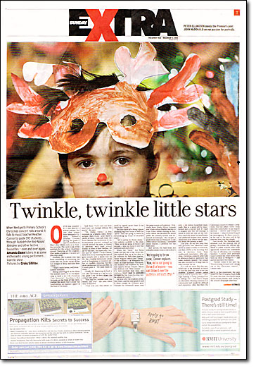 "Every wriggle they make (and there's plenty of them, especially from the boys), betrays the excitement of the forthcoming concert, echoed in schools around the state: a chance to perform, with their school friends, in front of their families. All of the teachers, but especially Connor and art teacher Carolyn Shiels, have been busy ensuring the school gym morphs into a music hall for the day: creating inexpensive props such as bandannas or reindeer antlers or candles, ensuring the students perform as well as possible. As Connor puts it: 'We want them to shine.'